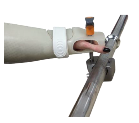 Une orthèse sur mesure a été réalisée après moulage du membre supérieur. Elle se fixe rapidement et solidement sur la barre de CrossFit via une broche à bille, avec compatibilité pour différentes tailles de barre grâce à plusieurs noix de fixation adaptables.